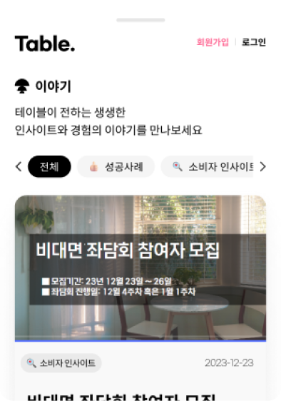 트렌드 분석, 컨셉 개발, 제품 최적화, 브랜드 진단 솔루션 등을 포함, 마케팅 전 과정에서의 핵심 이슈를 브랜드, 테이블 소비자, 전문 마케터가 함께 참여하여 최적의 해결 방안을 제시합니다.